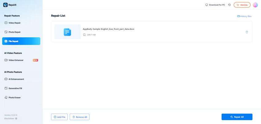 After you upload the corrupted file, hit the “Repair All” button to start the file repair process.